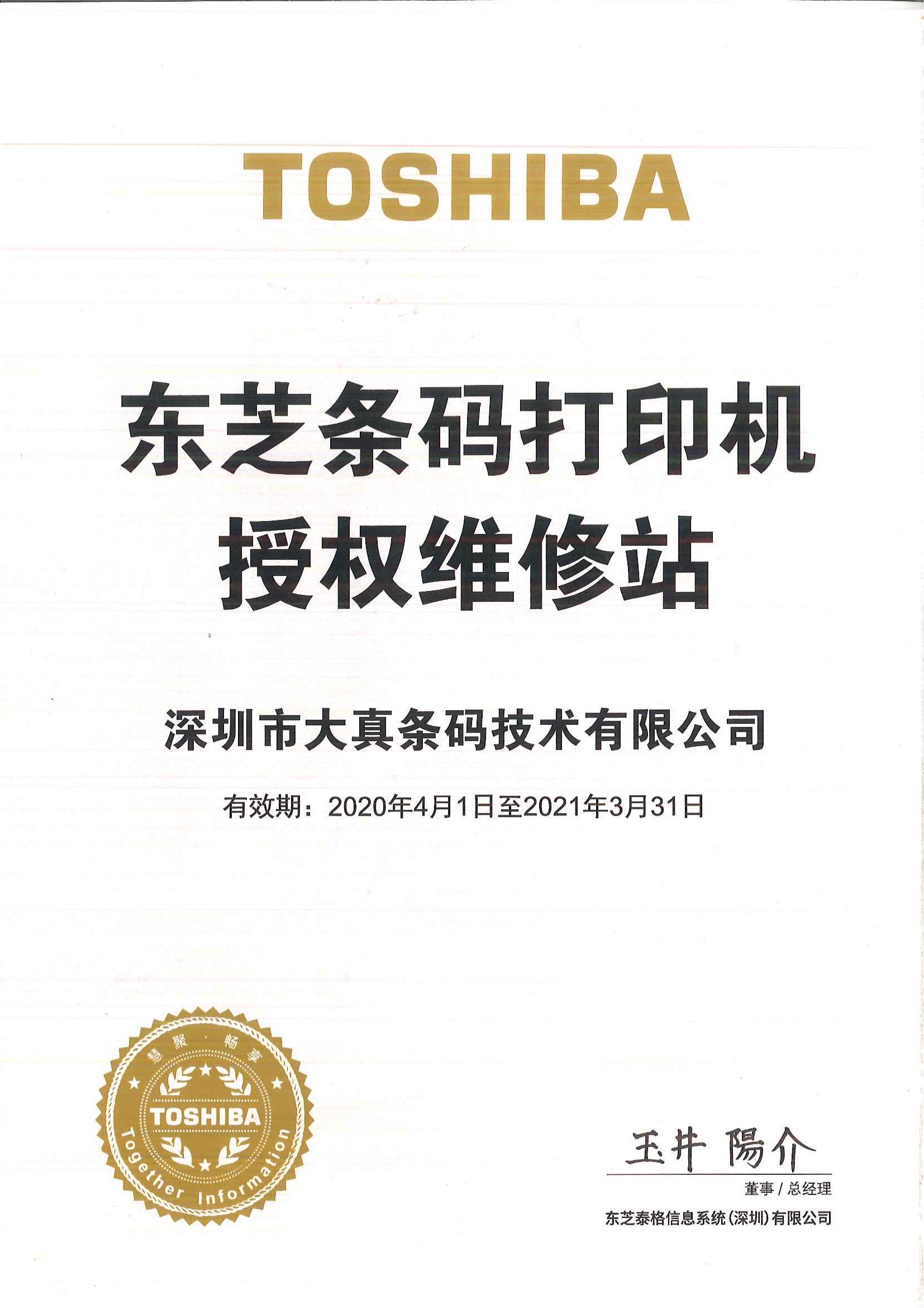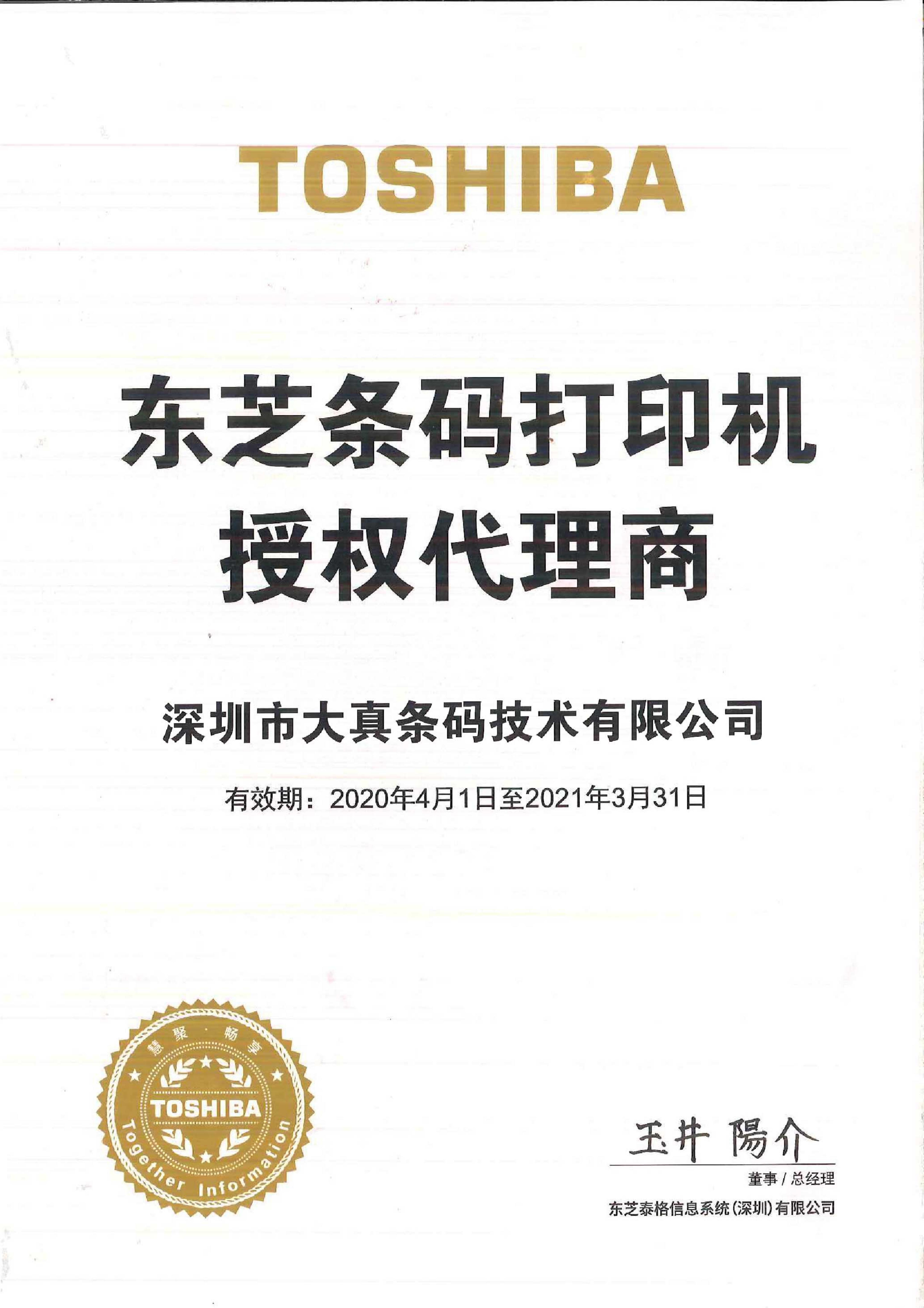 2020年东芝代理证书