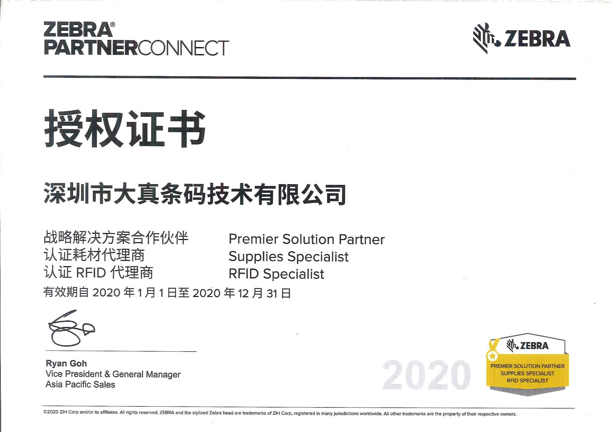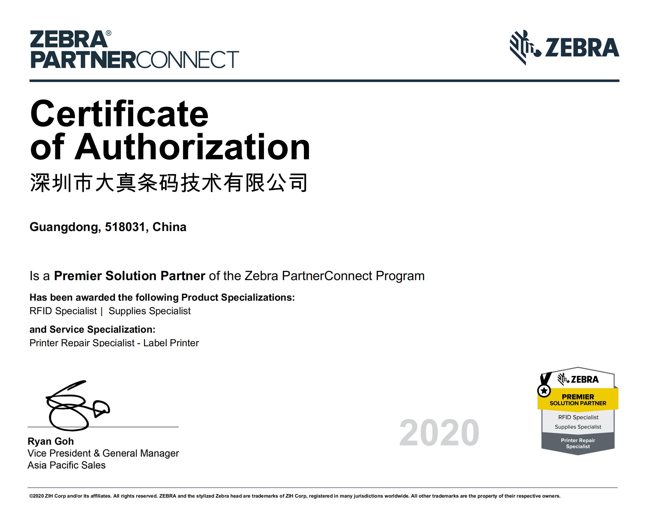 2020年斑马维修商资质证书