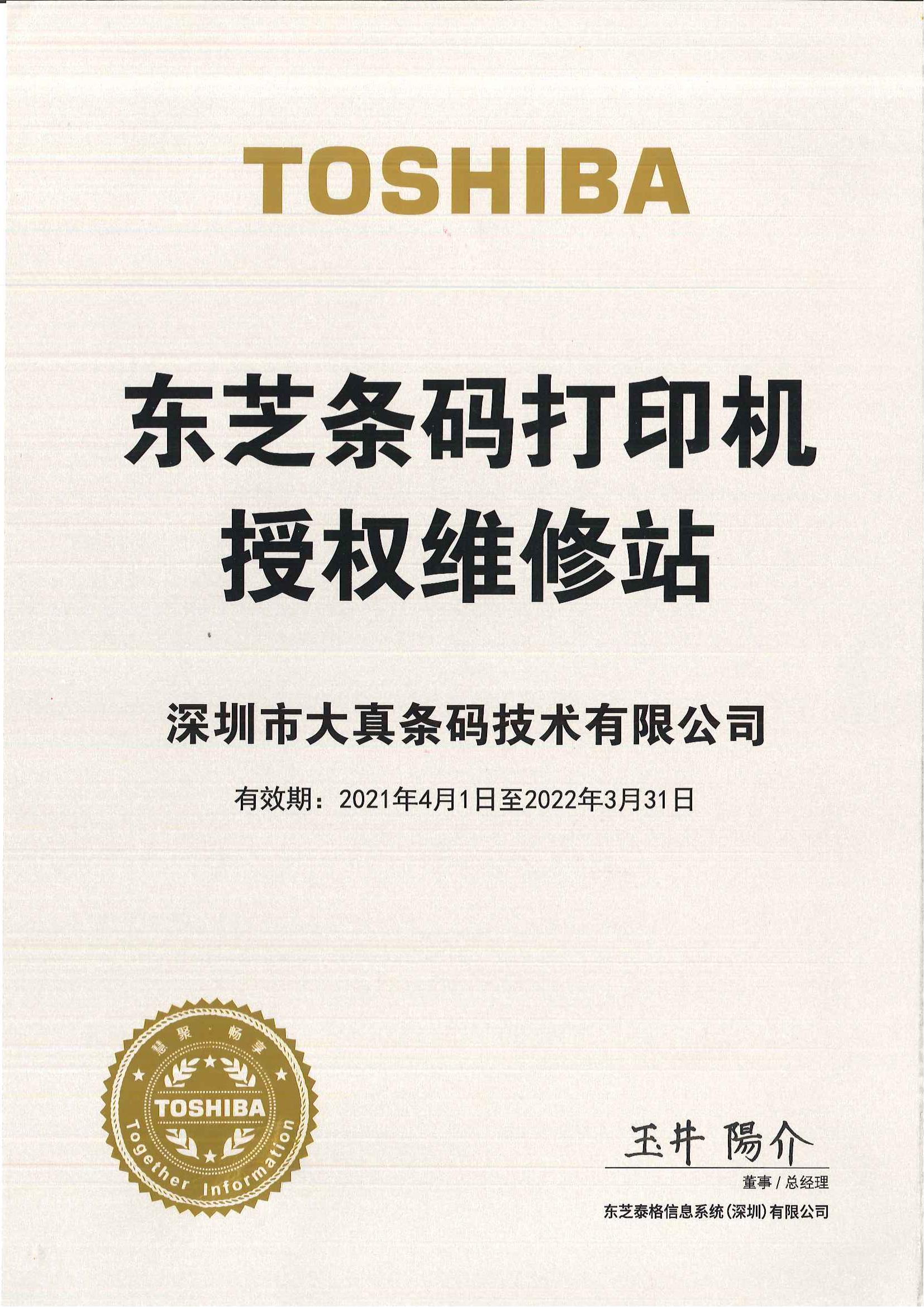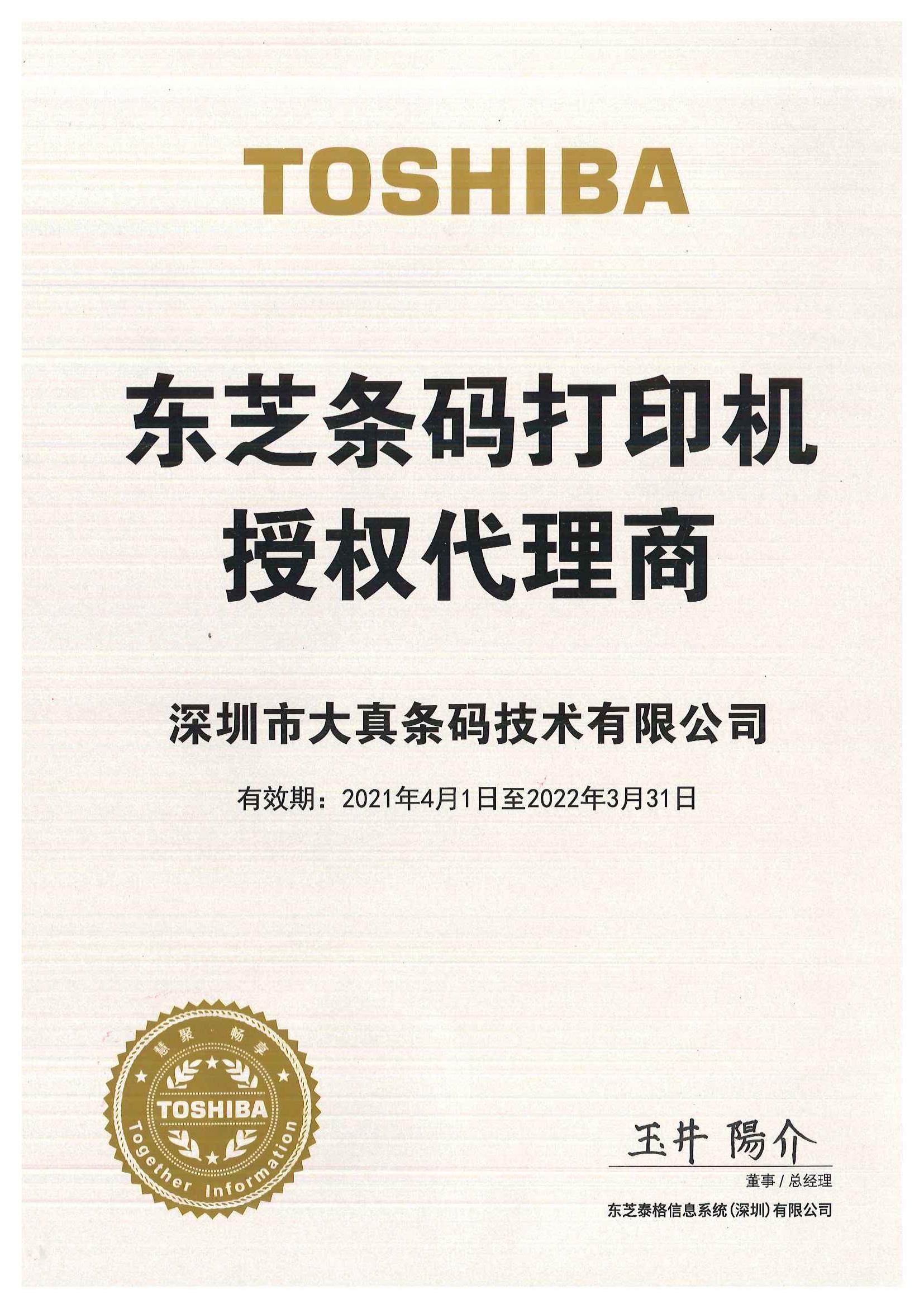 2021-2022年东芝代理证书