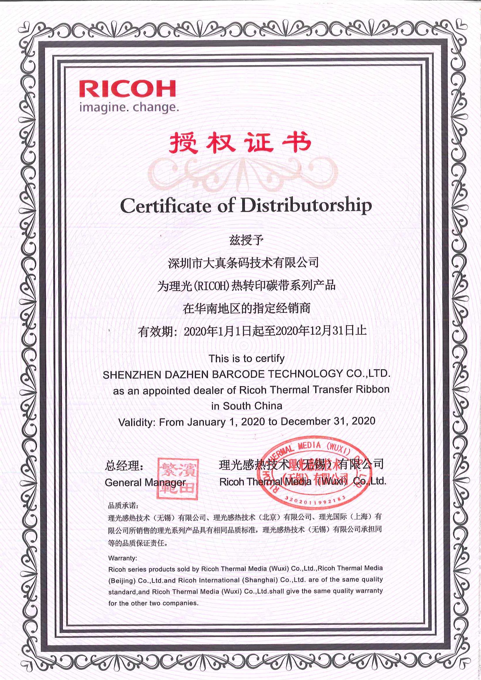 2020年理光代理证书