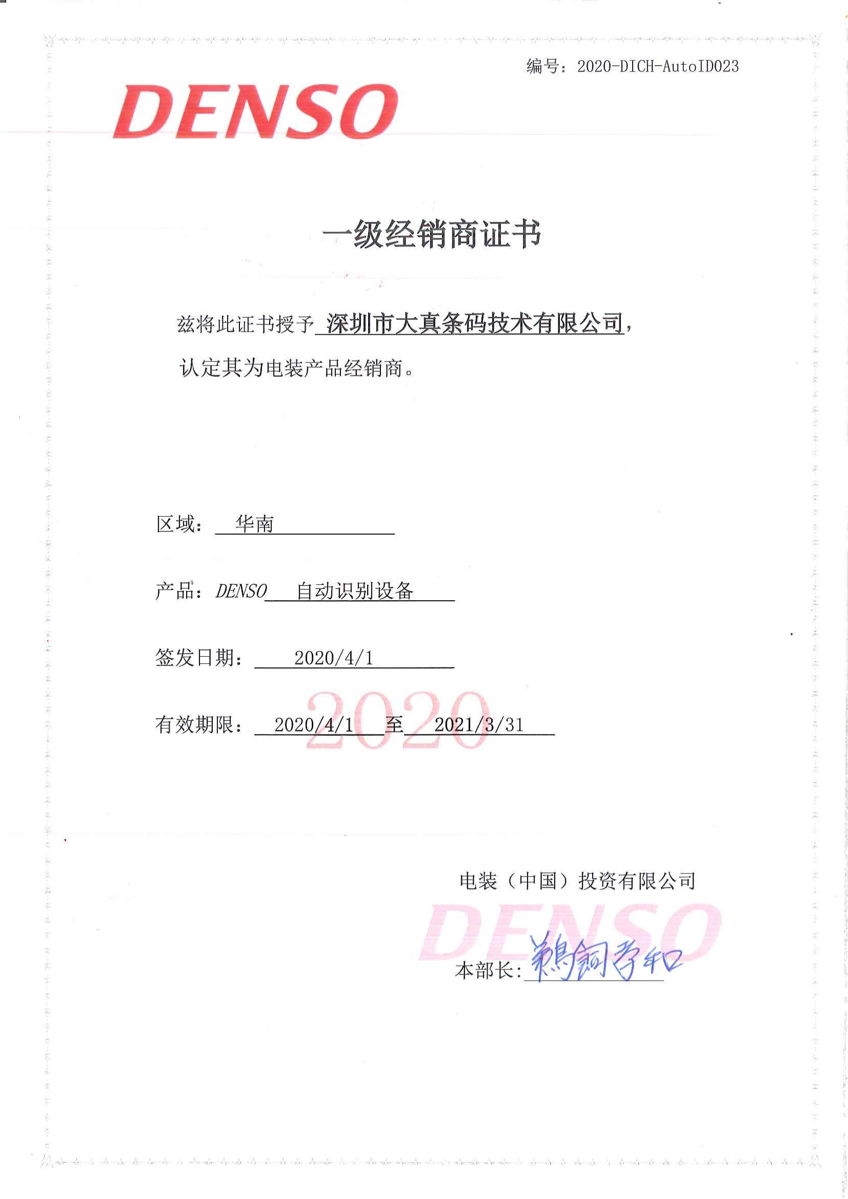 2020年电装代理证书