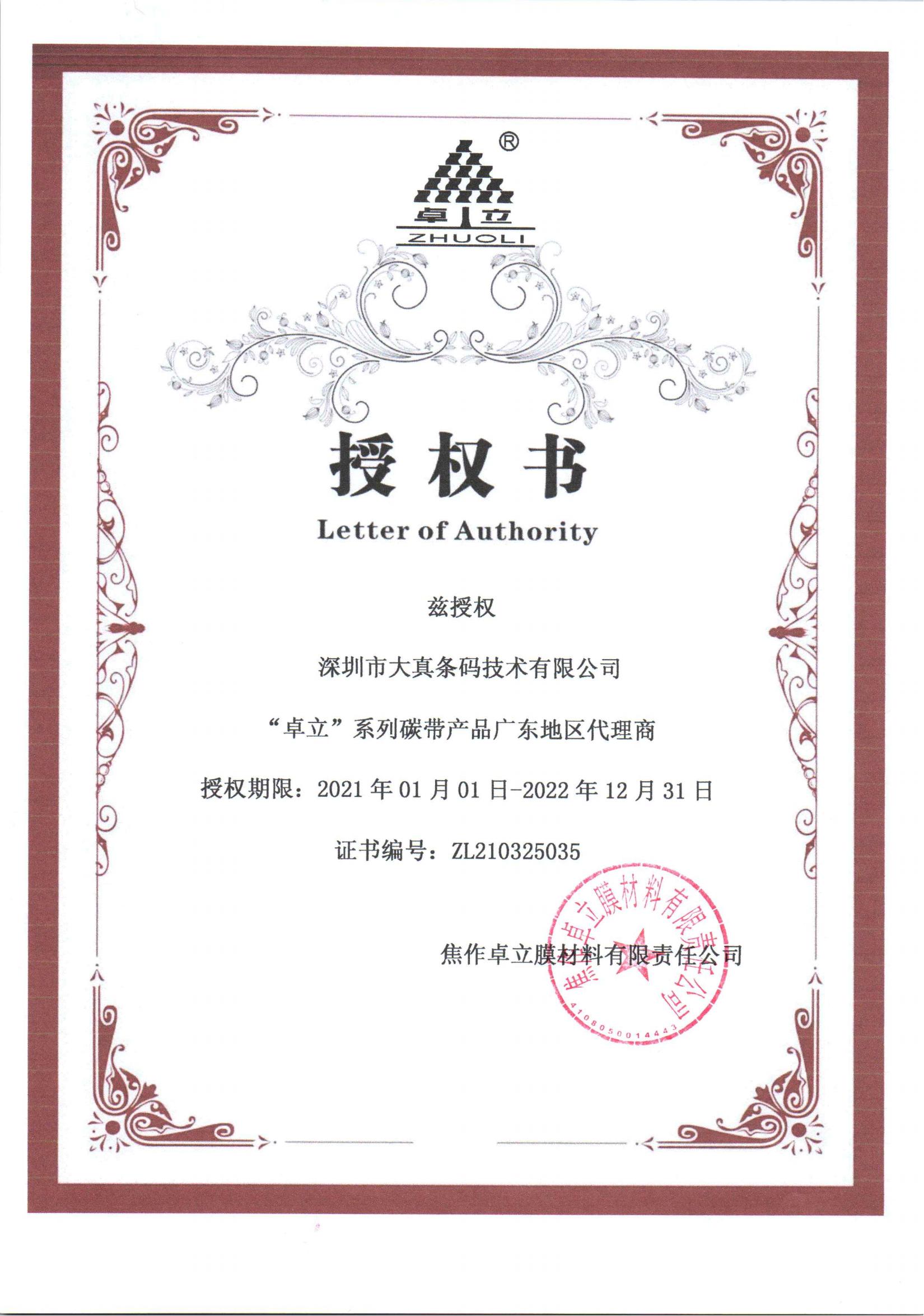 2021-2022年卓立代理证书
