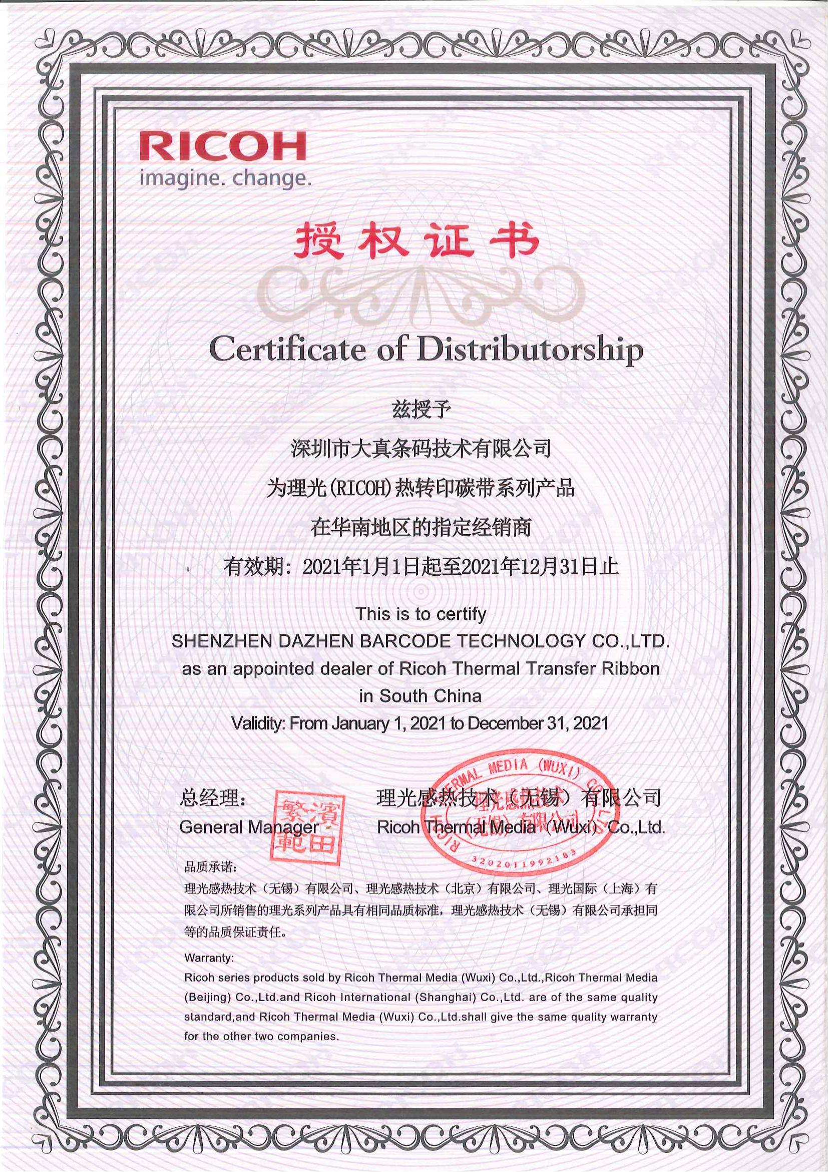 2021年理光代理证书