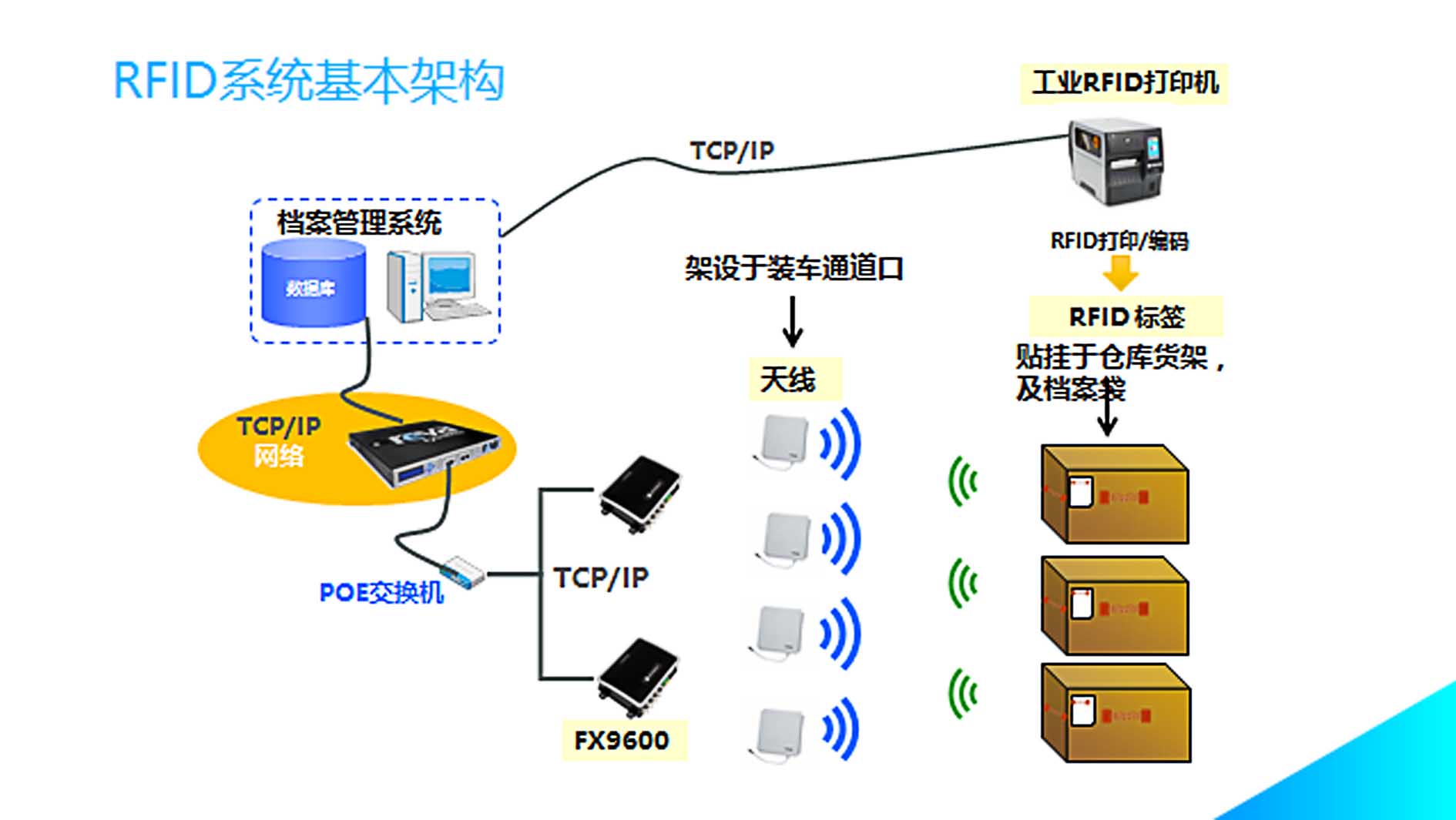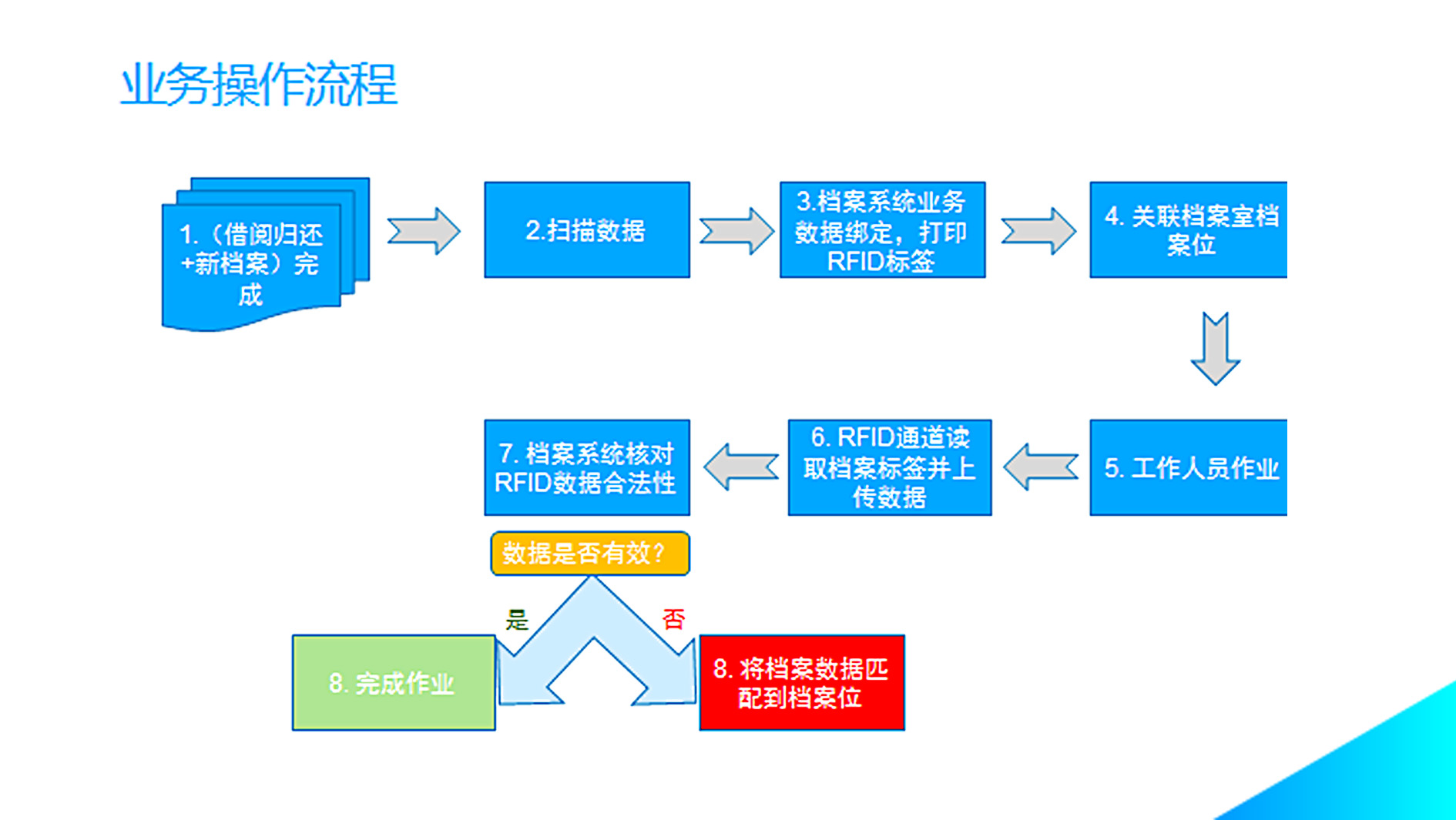 通过档案管理系统,生成档案信息数据,通过RFID打印机打印出RFID标签数据,贴在相应的档案文件上面;通过扫描设备扫描上传数据匹配及正常流程作业;