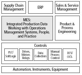 下图是国际MES协会所描绘的制造企业信息系统体系结构,MES起到了ERP/MRP-II和车间自动化系统间承上启下的作用。