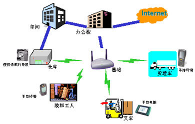 基于IEEE 802.11b的无线局域网标准的无线基站,可以和任何符合标准的设备互连,信号覆盖可以遍布整个企业园区的每个角落,不论是在办公区,厂区,库房还是在院子中,都可以通过移动终端实现实时的数据传输。