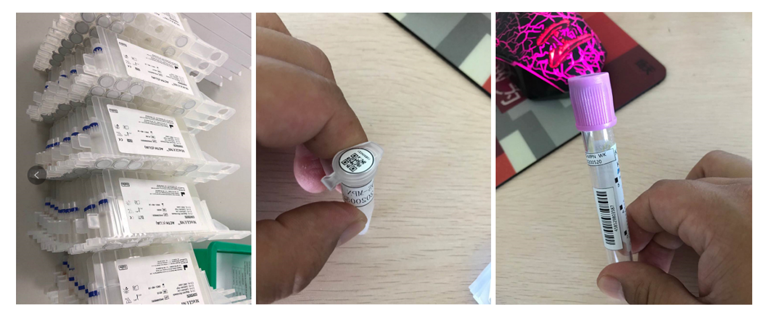 1.对应的提取试管瓶,系统序列号,序列号是用来和检测者的信息相互绑定的,然后用条码打印机打印序列号。(序列号绑定的信息为检测者的个人信息如姓名、性别、身份证号等)
