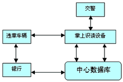 在现有交通管理模式中,交警对车辆违章处罚主要还是采取人工方式。在应用二维码技术之后,交警在执勤时,一旦发现车辆违章(例如闯红灯、酒后驾驶等),交警可通过二维码掌上识读设备对违章驾驶员的证件上的二维码进行识读,系统自动将其码中的相关资料传到掌上设备的数据库中,并且交警根据车辆的违章类型,将其违章情况直接记录在掌上识读设备中,并可根据其违章类型开具处罚单椐。每天通过掌上识读设备与交警部门的中心数据库的上传下载,可将交警当班所查车辆数及处罚的全部记录上传到中心数据库,同时中心数据库也会将每天最新车辆信息下载也掌上识读设备,实现对车辆违章处罚的有效管理。图例如下: