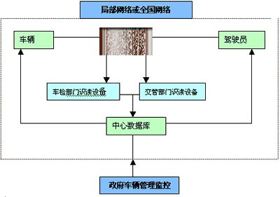 5.车辆监控网络 以二维码为基本信息载体,建立局部的或全国性的车辆监控网络。以上已经举例说明二维码作为一种基本的信息载体,将随着客体(车辆、驾驶员等)在变化的时空中运动,如何实施对客体运动轨迹的跟踪和有效的监控,必须通过以车辆的基本信息为主体,采用相应的二维码识读器与政府车辆管理数据库的连接实现对车辆和驾驶人员的跟踪监控,保证车辆管理有效、实时和自动化。图例如下: