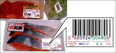 根据店铺的不同,被称作生鲜三品的肉、蔬菜及鱼等商品附带有不同的条码。这些商品的重量各不相同,因此只要在计量秤中输入100g的价格,然后分别放入秤中就会打印出表示商品品名及与其重量相等价格的条码,并贴附在每件商品上。 所谓店内条码是指只在店铺中、或特定的 流通途径中贴附通用条码的条码。 象这样价格各不相同的商品、以及点心、副食等店铺制作商品等附带加入价格的条码。由于这些商品不向计算机咨询价格,因此称作“NON-PLU”商品。 由于计算机中全部存储有这些NON-PLU商品的销售动向,因此可以通过分析数据,制定恰当的销售方案,如为防止生鱼片干燥最好每隔几分钟补充一次、从几时起每隔几分钟陈列点心最佳等。