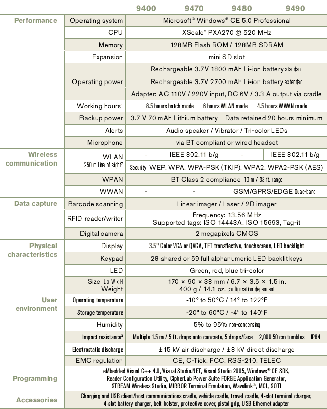 All the right data capture tools, wireless communications, signature- and image-capture technologies, and display input devices are integrated in the 9400 series. Manage more information from more places, using barcode, RFID (*), camera, keypad, and touchscreen. Put the whole world in one hand with the new 9400 series mobile computers.