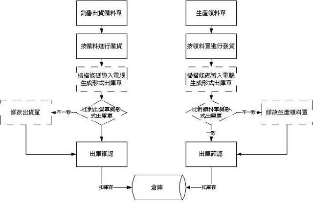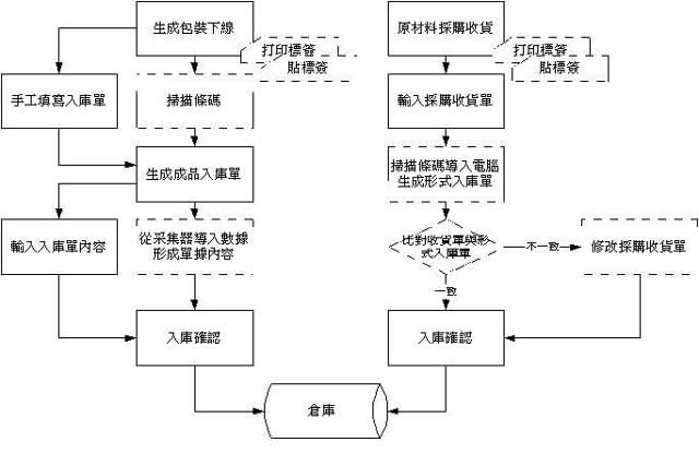 A. 流程图中的虚框部分处理的作用在于用条形码辅助操作来进行一步保证数据的准确性,工厂可以根据自己的实际情况来决定是否需要止环节的处理,比如说在发货时目前的操作可以做到很高的准确性,那就没有必要再使用条形码来对此进行管理