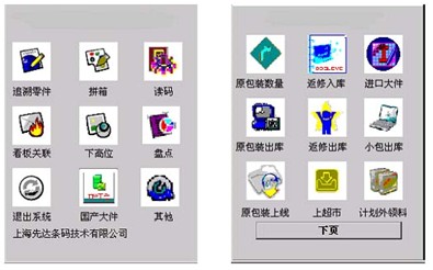 汽车零件配送中心无线应用程序主要包括以下几个功能模块:用户登录及信号测试(包括网络设置),可追溯零件扫描,拼箱,读码,看板卡与拉动单关联,再包装计划下载,盘点,国产大件标准包装出库,原包装数量修改,返修零件入库,标准大件包装出库,原包装出库,返修零件出库,标准小件包装出库,原包装上线,标准包装上超市料架,计划外领料,原包装数量输入,标准包装数量修改,标准包装下线,原包装剩余数量确认,通知下载,拼箱内取原包装,密码修改,零件信息查询等。