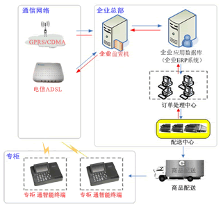为此大真条码专门推出了“专柜通”零售终端控制管理无线解决方案来实现这一需求。本方案采用无线方式由部署在各销售柜台的“专柜通”智能终端(以下简称“终端”)通过gprs/cdma移动通信网络来实现与企业总部之间信息的互相传递和共享,系统实现了总部、销售门店的一体化信息管理,实时进行销售、库存、账款、配送和市场信息管理。