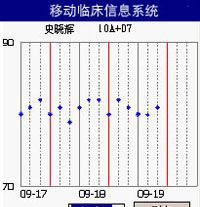 系统配备高性能的手持数据终端,借助无线网络,打破了以往在信息查询、体征录入和医嘱执行上的以医院为中心的习惯,改变为以患者为中心的业务流程。医护人员可以随时随地查询患者近几天的体温、心率、呼吸、血压等生命体征信息,也可以查询医嘱状态、执行时间等信息。体征录入的时候,将以前先手工记录,再几经转抄,最后才通过电脑录入,记录到数据库的旧模式,改为使用手持数据终端,在床前直接完成录入体征数据工作,减少了手工记录和手工转抄等中间环节。信息的查询上,系统提供两种查看方式:趋势图方式和列表方式。趋势图方式以图形化的形式直观地显示患者的体征发展变化情况,如图4所示。使用此系统,护士的工作效率提高了,更为重要的是,避免了数据由于手工转抄而造成的差错。